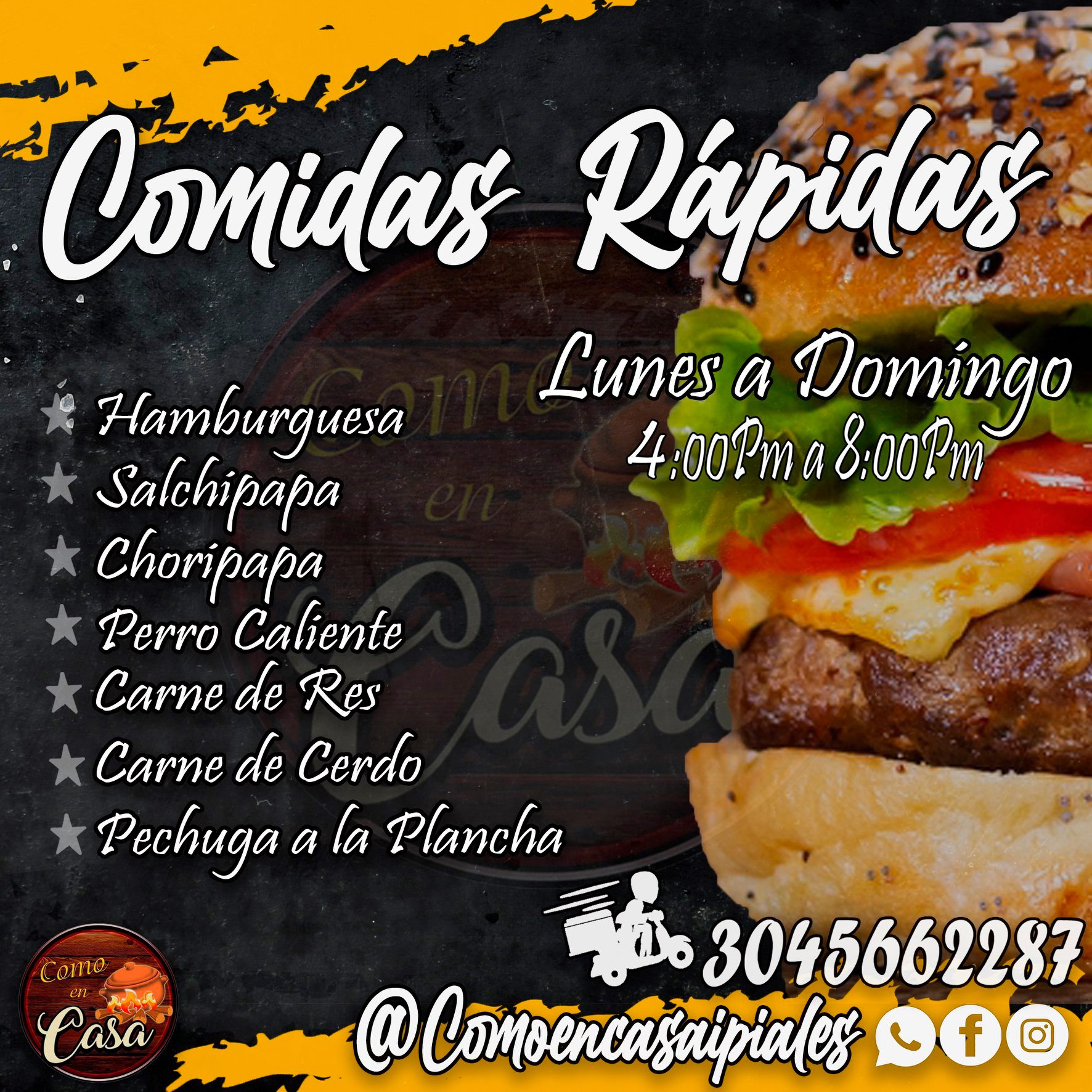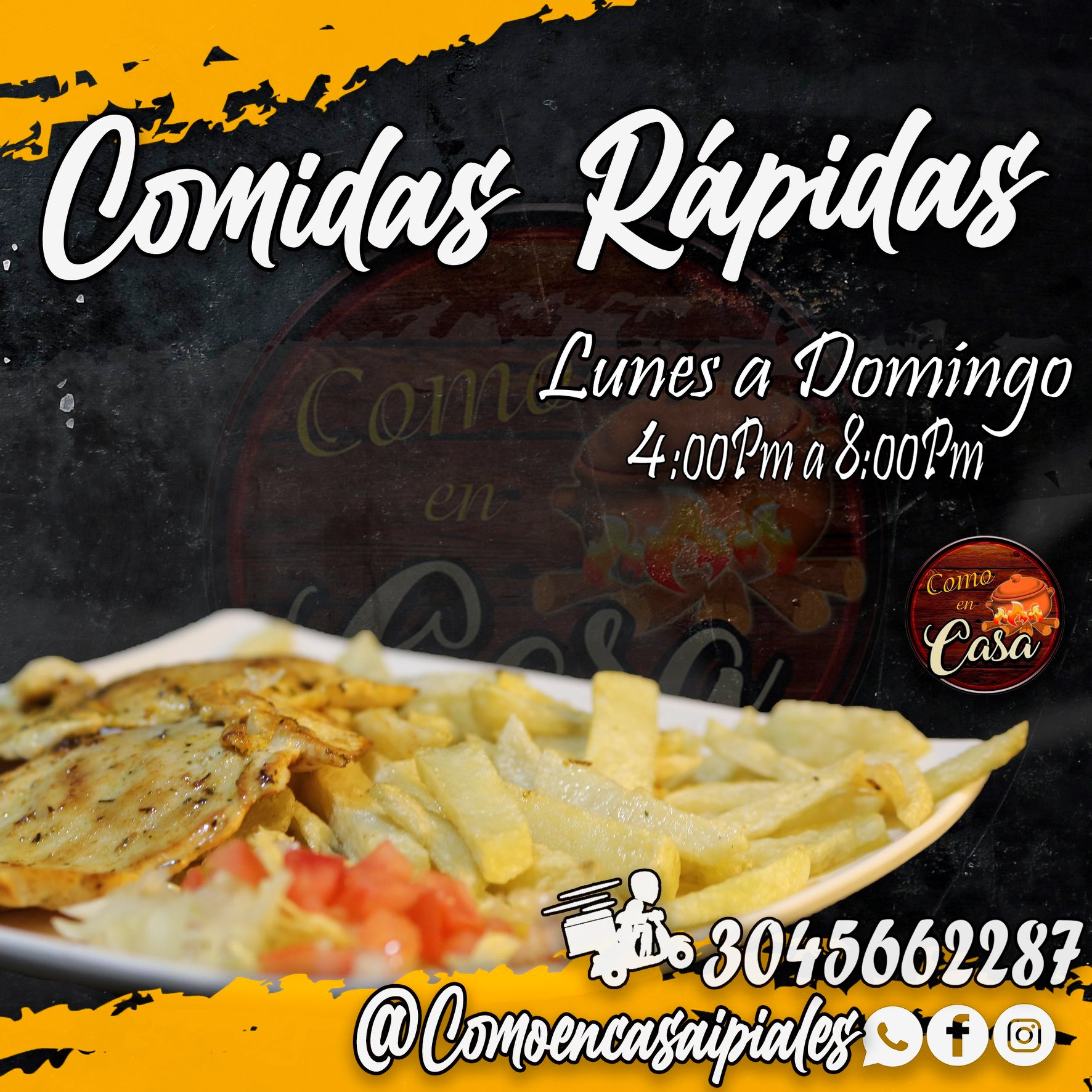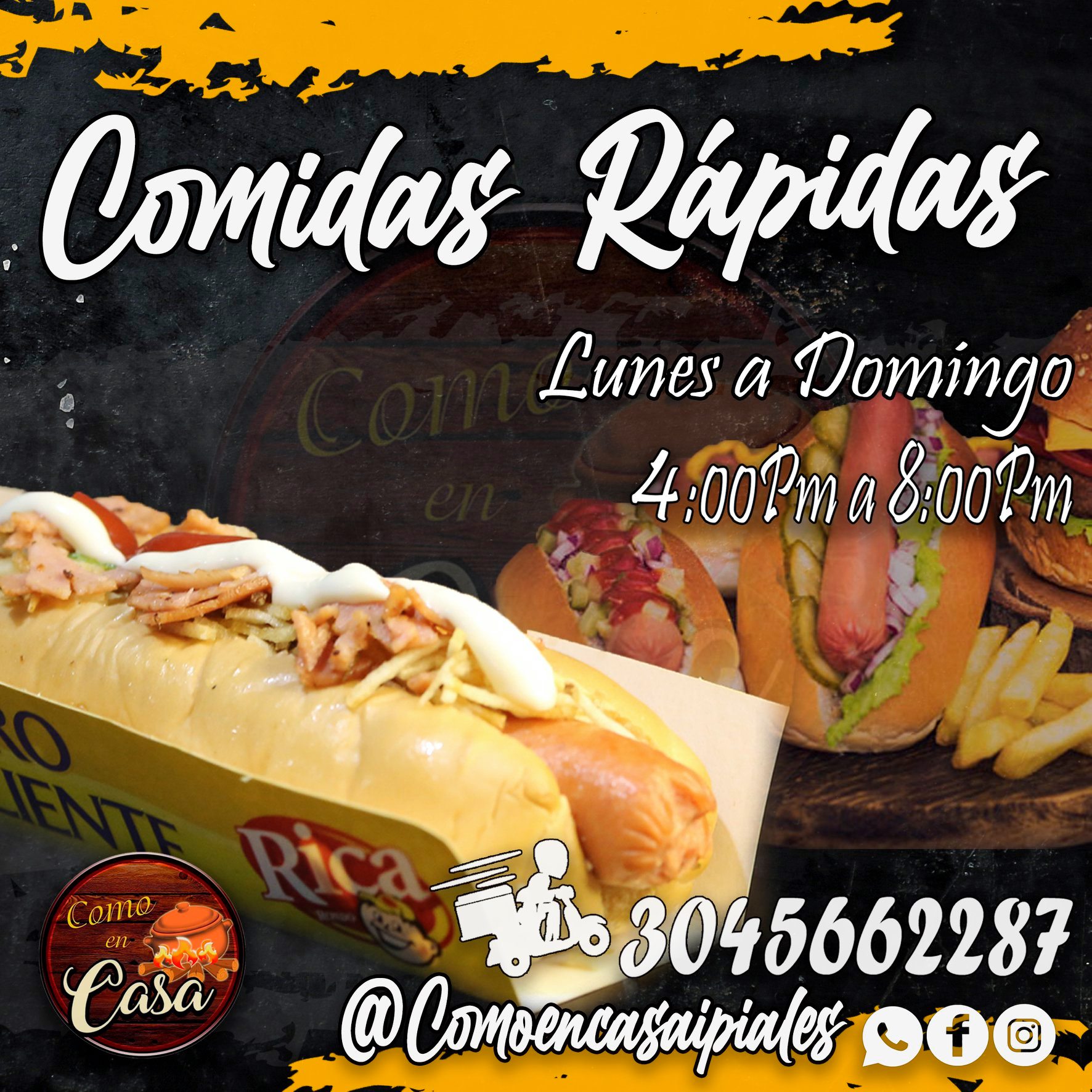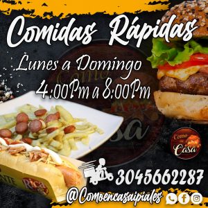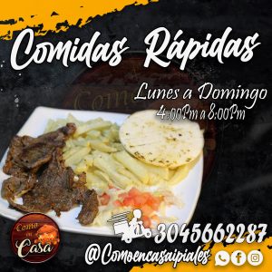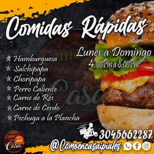 Ven y disfruta de tu comida rápida favorita! salchipapa royal, alitas bbq y chorizo parrillero…como nunca antes.Restaurante de comida casera y comidas rápidas las más deliciosas de la ciudad, platos especiales los sábados y el menú del día solo a $6000 !Te esperamos! – Cra 5 # 5-08 Barrio golgota, Ipiales, Colombia – 304 5662287 comoencasaipiales@gmail.com